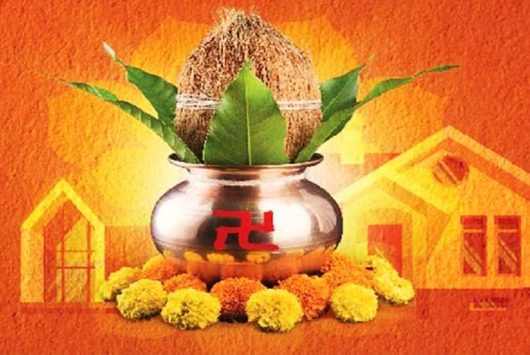 - Deity & Rituals: Ganesh idol, red/yellow cloth, Kalash with coconut & mango leaves, Panchamrit.