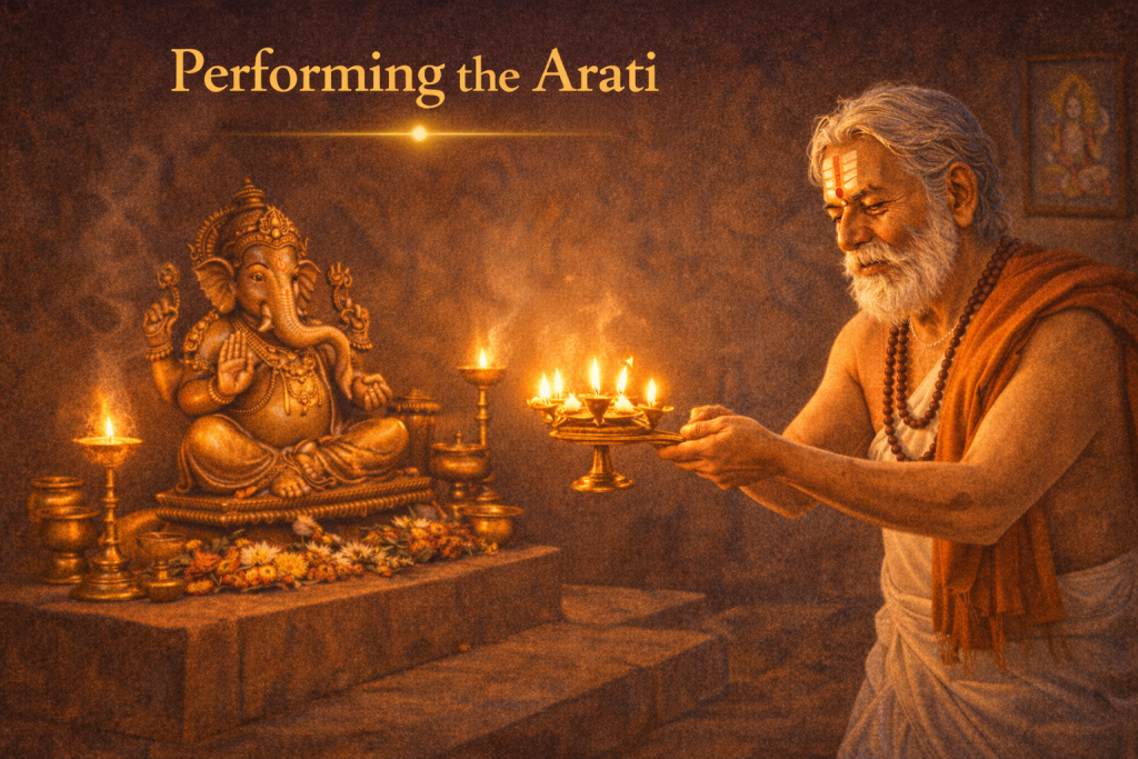 Arati is a devotional offering of light accompanied by prayer or song. Waving the lamp in a circular motion symbolizes wholeness, harmony, and completion. This step marks the emotional peak of the ritual, allowing devotees to express gratitude and surrender. The warmth of the flame and rhythm of the chant create a powerful spiritual atmosphere, sealing the puja with devotion.