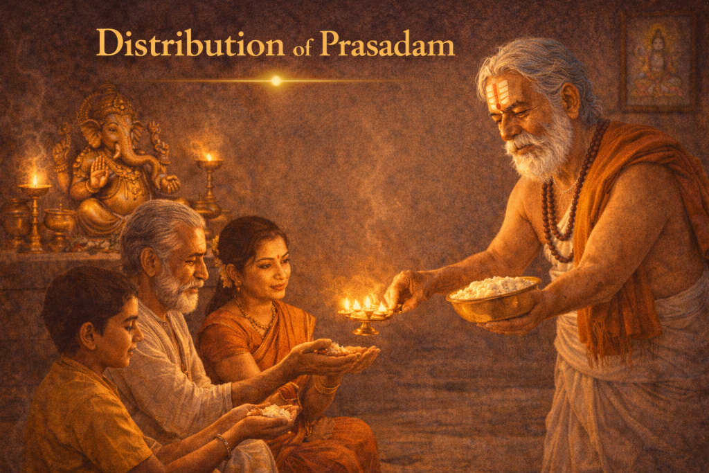 After the puja, the offered food is shared as prasadam among family members. Sharing prasadam reinforces unity, humility, and gratitude. It is believed that prasadam carries divine blessings and purifies intentions. Beginning the year by receiving and sharing prasadam fosters emotional harmony and reminds everyone that spiritual growth is a shared journey within the household.