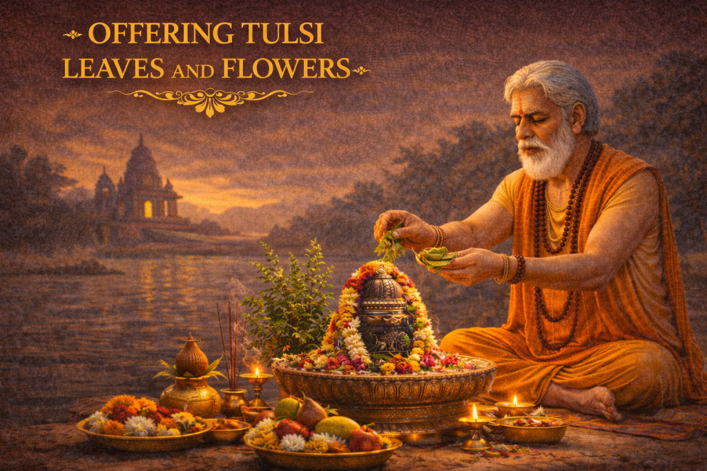 Step 8: Offering Tulsi Leaves and Flowers